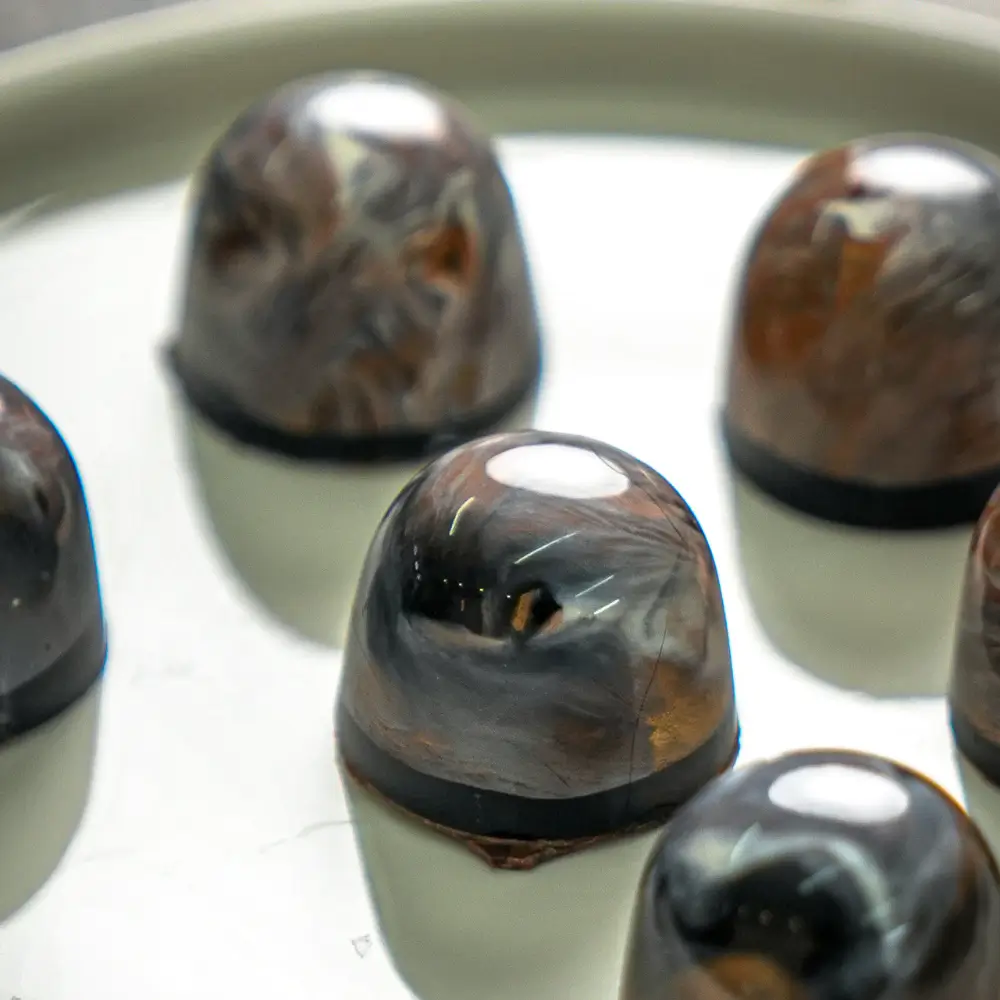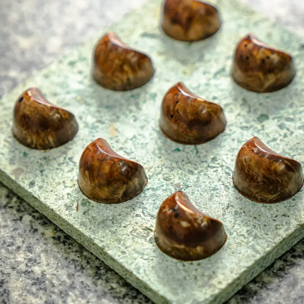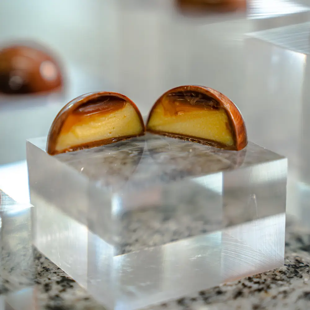 Silky toasted egg custard white chocolate ganache layered with burnt caramel in milk chocolate.
