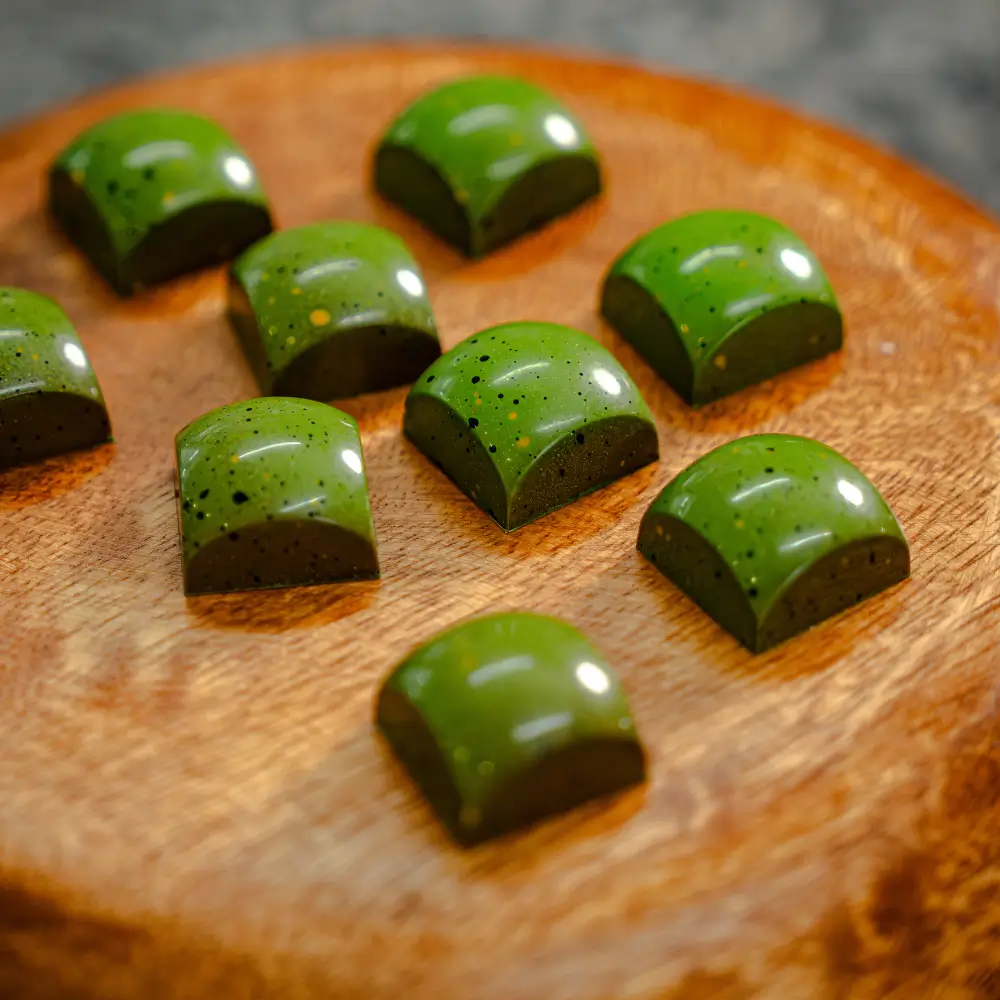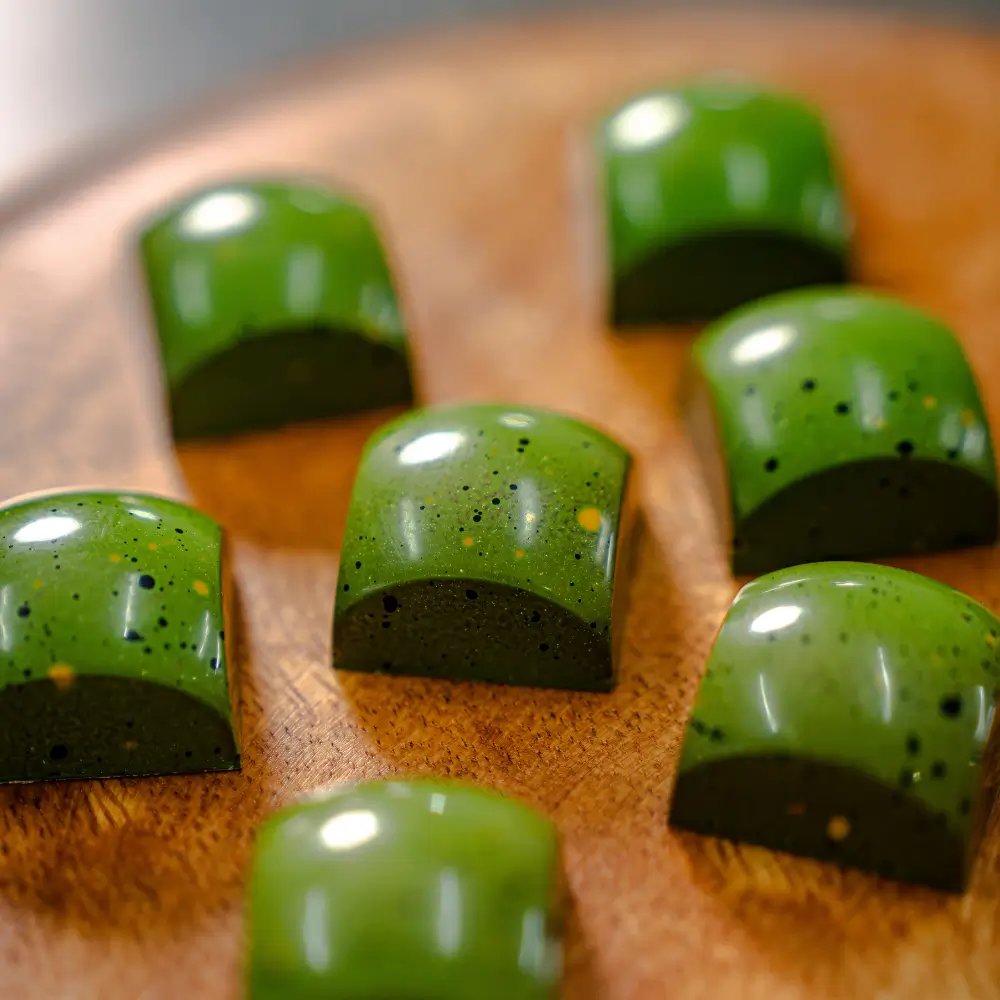 Roasted chicken ganache layered with confit onion jam, tangy calamansi caramel, and white chocolate mayo ganache, finished with crisp mushroom chicharron.